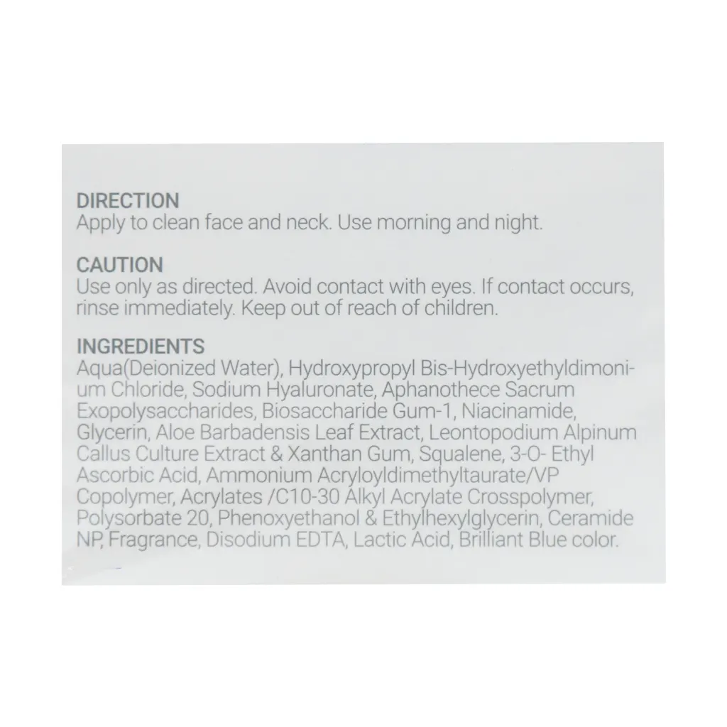 آب، هیدروکسی پروپیل بیز-هیدروکسی اتیل دیمونیوم کلراید، سدیم هیالورونات، اگزو پلی ساکاریدها، بایوساکارید گام-1، نیاسین آمید، گلیسرین، عصاره آلوئه ورا، لئونتوپودیوم آلپینوم؛ عصاره کشت بینه و زانتان گام، اسکوالن، 3-0 اتیل آسکوربیک اسید، آمونیوم آکریلوئیل دی متیل تائورات، cp کوپلیمر، آکریلات/c10-30 آلکیل آکریلات کراس پلیمر، پلی سوربات 20، فنوکسی اتانول، ایتل هگزیل گلیسرین، سرامید ان پی، رایحه، دی سدیم ا د ت ا، لاکتیک اسید، رنگ