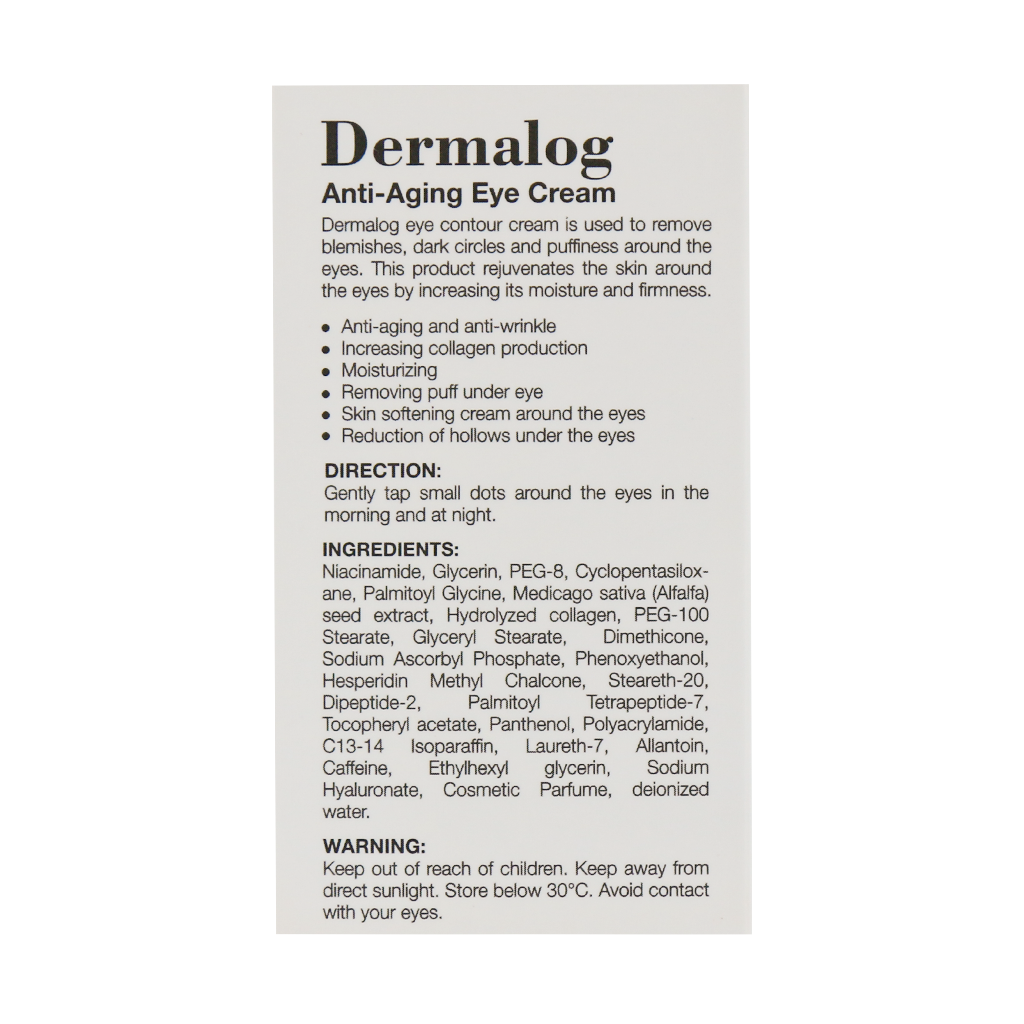 - کرم ضد چروک دور چشم درمالوگ به طور موثر در کاهش تیرگی و گودی زیر چشم نقش داشته و شفافیت و روشنایی پوست را افزایش میدهد.